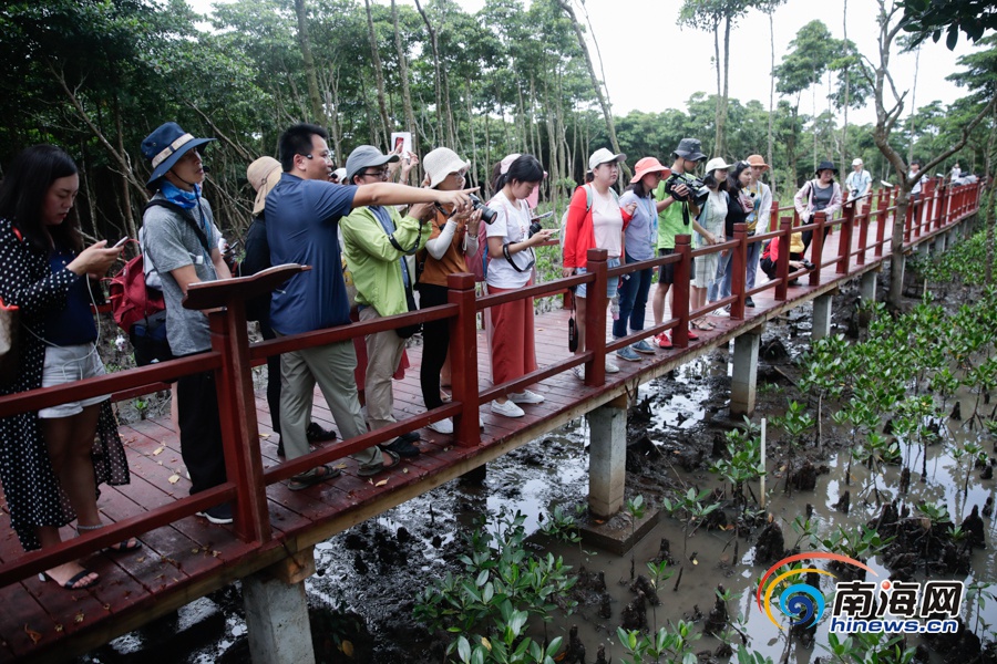 参加“新时代·幸福美丽新边疆”海南行网络主题采访活动记者在海口东寨港红树林国家级自然保护区采访。南海网记者刘洋 摄