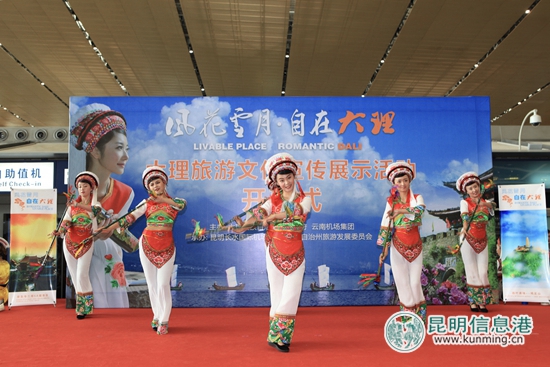 6686体育讯 记者上官艳君 6月13日,以“风花雪月 自在大理”为主题的大理旅游文化宣传活动在昆明长水国际机场举行,100余幅反映大理旅游文化的自然风光和民族风情的摄影作品,以及大理民族舞蹈、非遗展示和特色旅游商品在机场航站楼亮相。