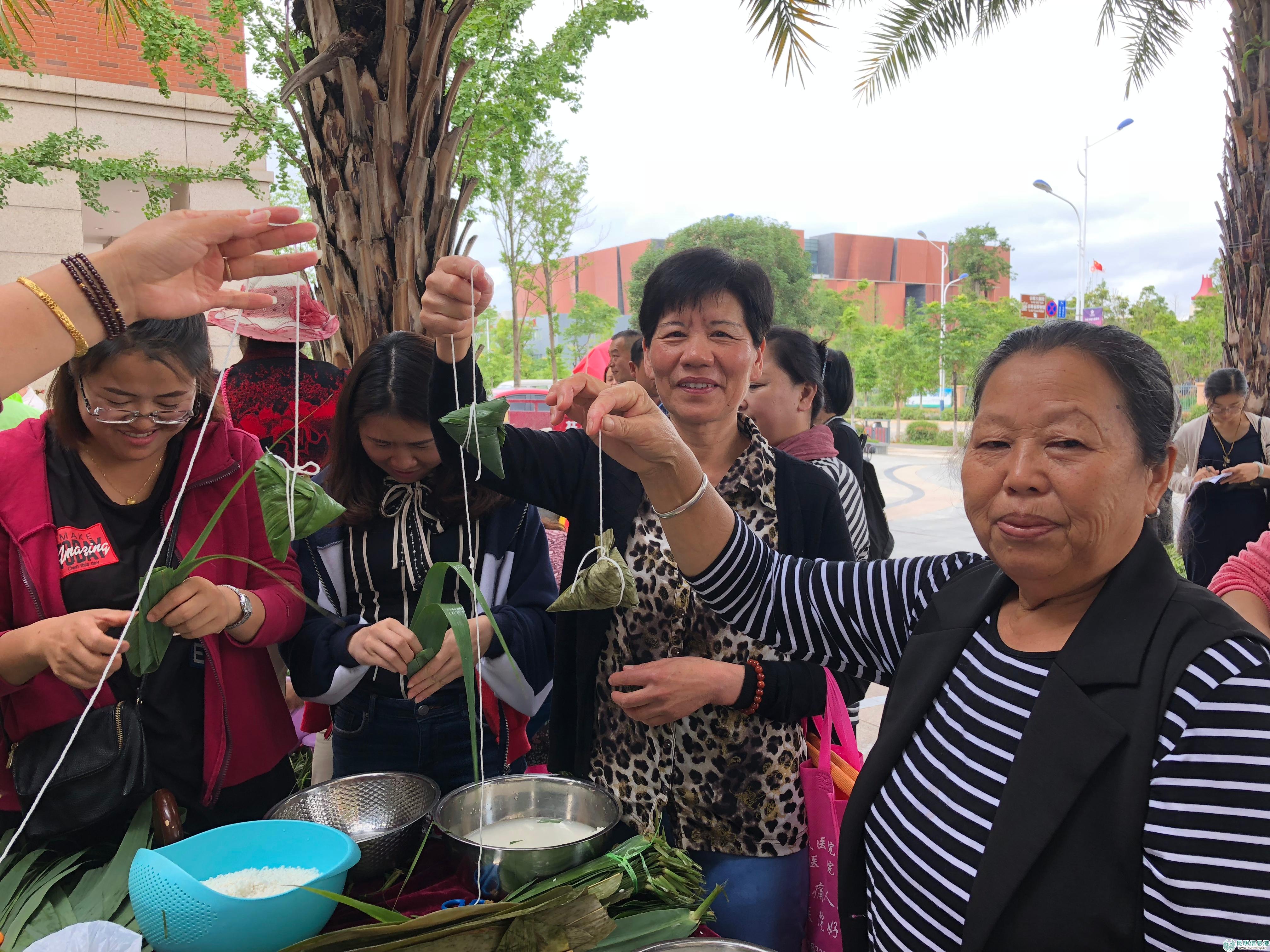 在云岭星河小区门口,来自街道各社区的居民们正兴高采烈的包着粽子,桌子上摆满了糯米、粽叶、和花生、火腿、豆沙、大枣等馅料,大家根据自己口味来选择制作粽子。来自罗衙社区的梅家三姐妹首先领头制作,展示自己精巧的官渡传统包粽子手艺,其他居民也不甘落后,大胆的亲手试做粽子起来,现场洋溢着欢快的节日气氛。“我们三姐妹都是土生土长的官渡人,从小就跟着妈妈学包粽子,像这样用一根线把所有的粽子包好了串成一串,每年我们都来参加着呢。”梅家大阿姨说道。“我7岁就开始包粽子了,跟着老人学,包了还拿着去赶街,卖了钱贴补家里。”另一旁的杨阿姨也回忆着说道。