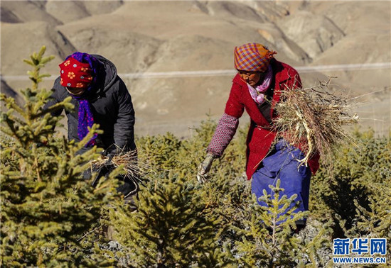 西藏山南市乃东区颇章乡农民在雪村苗圃基地内为雪松除草(2017年12月11日摄)。新华社记者刘东君摄