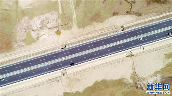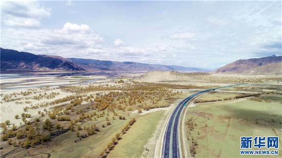 这是西藏雅鲁藏布江沿岸拉萨至山南高等级公路沿线经防沙固沙工程改造后的局部画面(4月11日无人机拍摄)。新华社记者刘东君摄