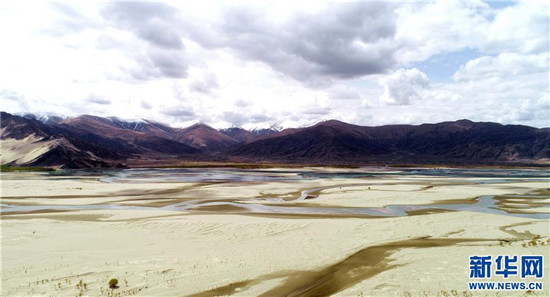 这是西藏雅鲁藏布江沿岸拉萨至山南高等级公路沿线的裸露河床,雅鲁藏布江沿岸防沙固沙工程将逐步覆盖这一区域(4月11日无人机拍摄)。新华社记者刘东君摄