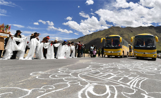 附近群众跳起牦牛舞、端着青稞酒和象征五谷丰登的切玛盒,献上洁白的哈达,欢迎远方的客人。