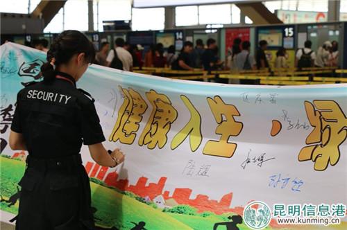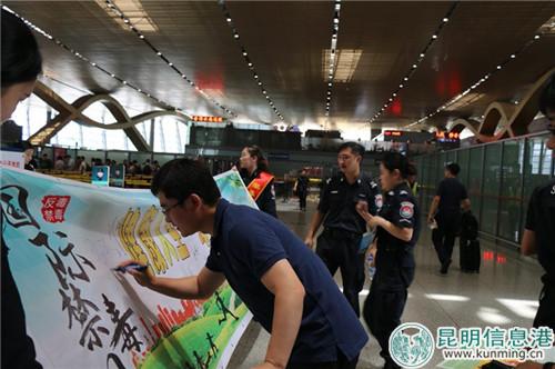 为了实现宣传效果全覆盖,昆明机场针对旅客、民航员工、航空公司机组人员和货主,分别在航站楼待检区、迎客大厅、值机柜台、飞行区一号安检道口以及物流货运区,分发禁毒宣传纪念品,做到宣传全方位、无死角。