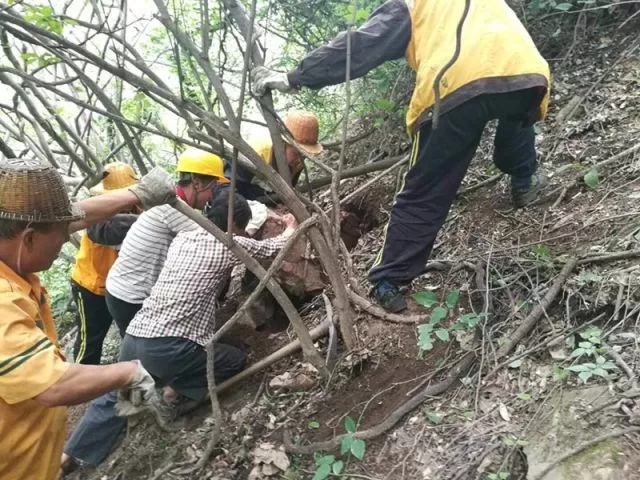12时34分,车工长发现几颗小树旁存在一处危石,在认真检查周围地质条件、岩石层理、流水路径后,他拿出上山随着携带的铁钎,探明石头的深度,及时处理了。