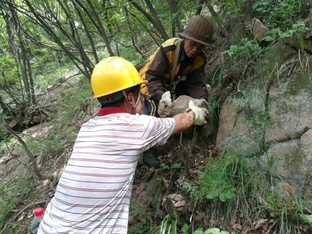 “这儿有一处活石,需要处理一下!”11时27分,职工李军迅速爬到危石处所,查看着周围的情况。“石头长25cm,宽14cm,高12cm,可搬动!周围大树根基稳固,山体无裂缝!可立即处理!”李军抓牢扶稳后,将石头递给平坡上的赵建忠,赵建忠抡起大锤,将小石头破碎成一小块状。赵建忠说,发现的危石最好破碎处理,防止山体溜塌或者地震等自然灾害,致使未经处理的石头再次滚落,造成崩石灾害。
