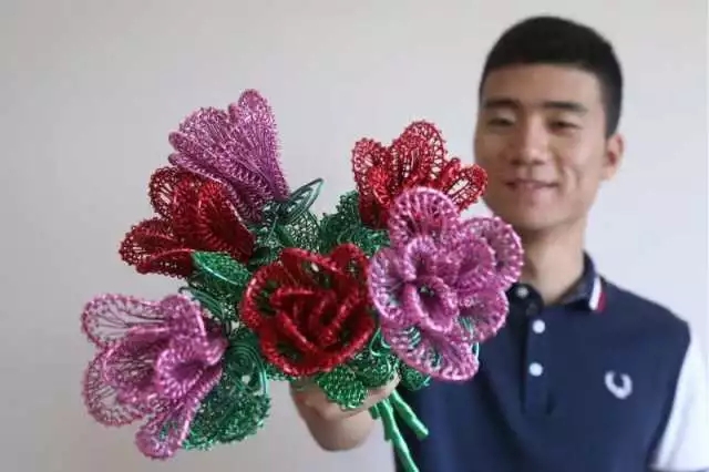 各种铝线在吴金磊的脑海和手中缠绕、弯曲、开合,变成了机器人的头颅、臂膀和炮筒,动物的羽毛、鳞片或利爪,日常生活中的桌子、日历、摩托车等,组成了一个独特的模型世界。几年下来,吴金磊已创作近万件作品,累计使用金属铝线1.2万多米,大黄蜂、龙凤恋、永不凋谢的玫瑰花等创意作品在网上热销,深受消费者喜欢。