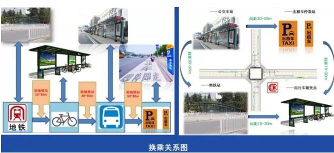 6.充分考虑地铁3号线与公交、自行车、出租车之间的换乘距离,完善公共交通设施,增加系统标识。结合人民路现状特点,在现状6个地铁站口(昵山站、昌源中路站、西苑站、梁家河站、市体育馆站、潘家湾站)附近调整原公交车站点位置、结合共享自行车停放点及出租车停靠点,尽量减少市民的换乘距离。地铁与公交车的换乘,公交车与自行车的换乘距离尽量控制在为30~50m范围内。