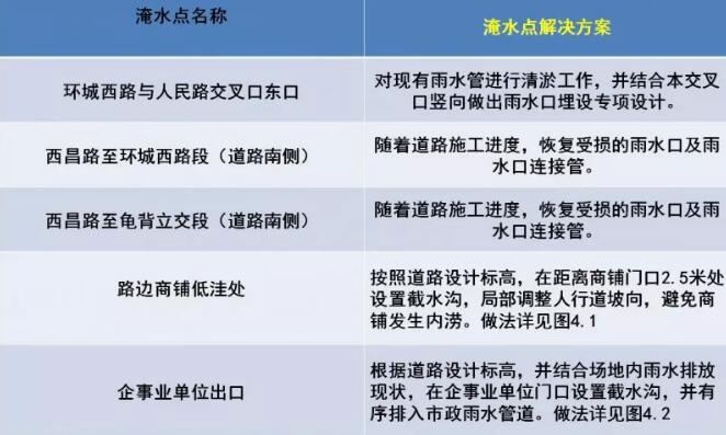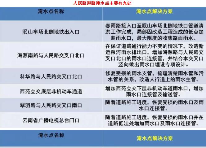 整治眠山车场北侧地铁出入口、海源南路与人民路交叉口北口、科华路与人民路交叉口北口、西苑立交底层非机动车通道、翠羽路与人民路交叉口南口、云南省广播电视总台门口、环城西路与人民路交叉口东口、西昌路至环城西路段(道路南侧)、西昌路至龟背立交段(道路南侧)、路边商铺低洼处、企事业单位出口等淹水点。