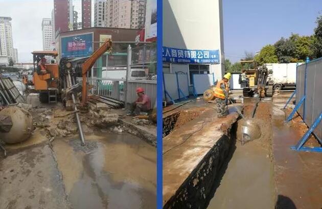 西苑立交东侧(腾龙巷处)110kv电力通道位于道路中央进入立交区域后改为道路南侧,原设计为开挖形式施工,为最大限度降低施工对交通的干扰,确保人民西路道路通行顺畅,改为托管施工方式,长约60m。