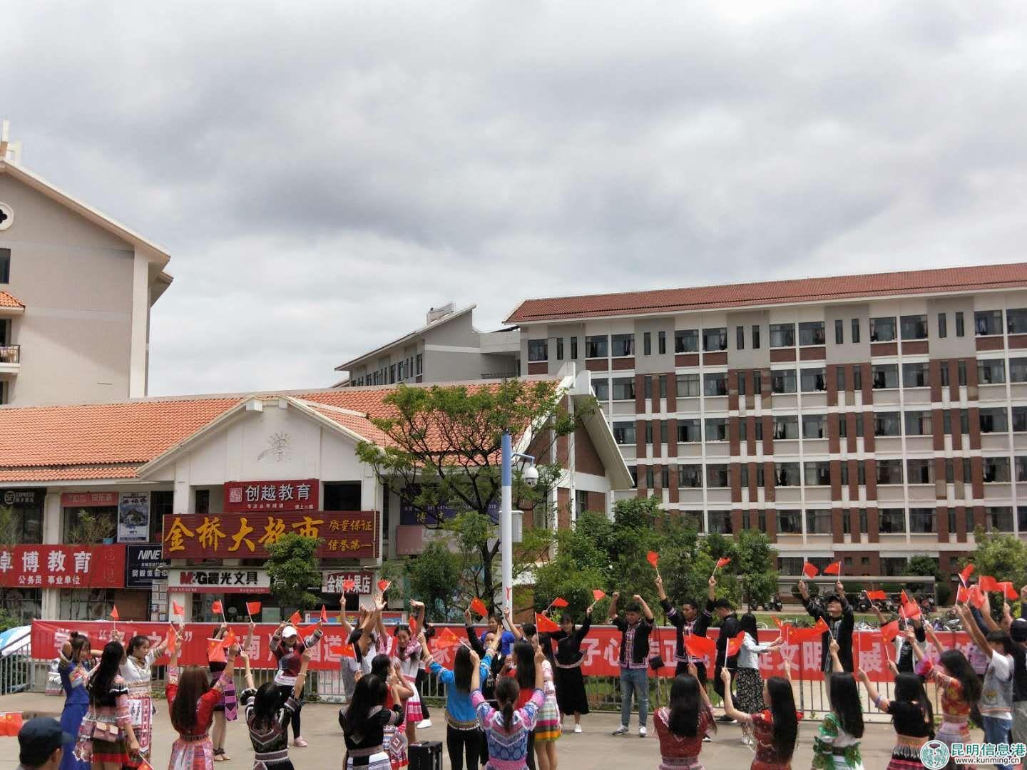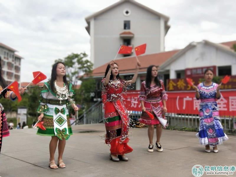 伴随着经典歌曲《爱的奉献》《生如夏花》的熟悉旋律,快闪活动拉开了序幕,100余人身着壮族苗族服装摇动着小红旗,喊着“学习全国道德模范农加贵精神,营造校园崇德向善文明风尚”“怀赤子心,传正能量,做好人,办好事”等充满正能量的口号。活动持续了约40分钟,大家纷纷发放小红旗及宣传册,壮家小伙姑娘吹起具有广南特色的芦笙,跳起打跳舞……最后,以一支《且兰传说》舞蹈结束此次活动。