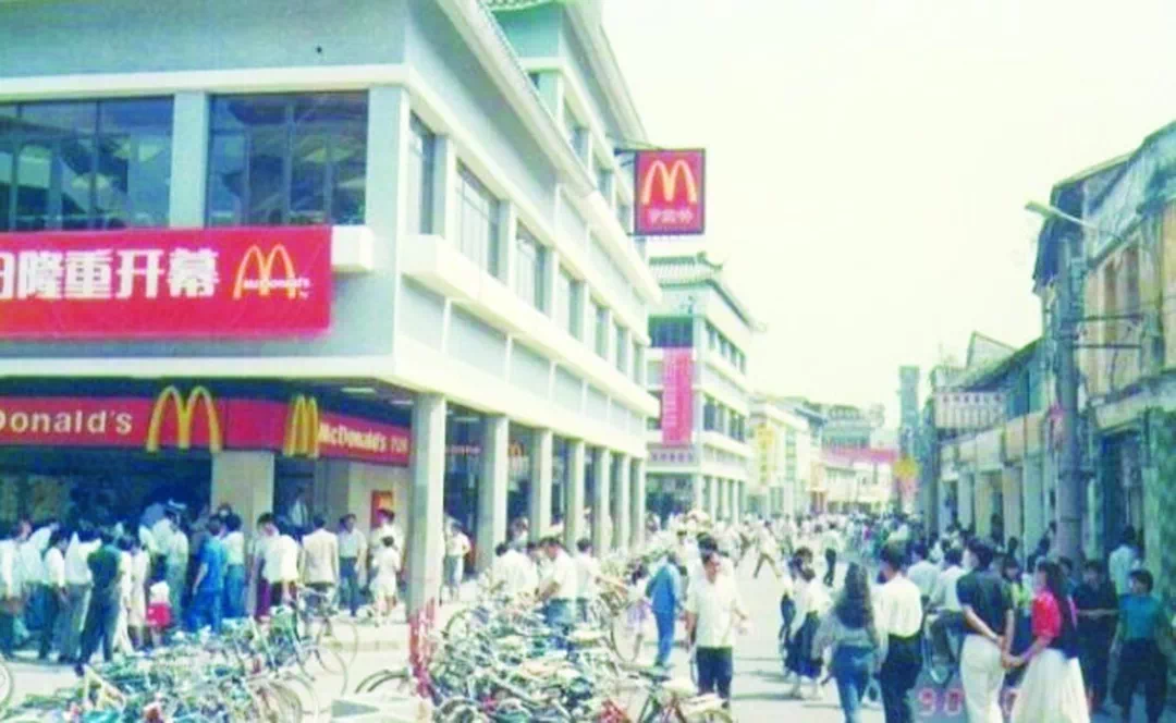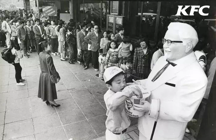 1987年11月20日,肯德基在北京前门正式开启中国第一家餐厅。开业那天,顾客几乎需要2小时才能等到一个座位。眼看着门口排队的人群快要挤爆,不得不求助警察来帮忙维持秩序。只要到周末,光餐厅外排起的队伍就有400多米,必须分段分时放人进来。前门肯德基变成了北京城里的“网红店”,上肯德基吃西餐变成了一件时髦的事,甚至成为北京旅游的一大景点。很多来到北京的人,必定要去肯德基尝一下,然后与门口的山德士上校人像留影纪念。
