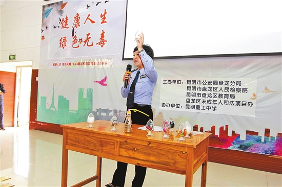 日前,昆明市公安局盘龙分局禁毒大队联合盘龙区人民检察院、盘龙区未成年人司法项目办在昆明市重工中学开展“法育少年 快乐成长”毒品预防教育进校园主题活动。活动现场,盘龙分局禁毒大队民警向在校学生讲解了毒品的危害,学生们以在签名墙上签名的方式来表达拒绝毒品的决心。云南日报 通讯员魏启刚 文/图