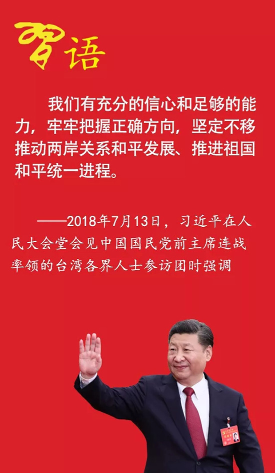 7月13日上午,中共中央总书记习近平在人民大会堂会见中国国民党前主席连战率领的台湾各界人士参访团时强调,大道之行、人心所向,势不可挡。我们有充分的信心和足够的能力,牢牢把握正确方向,坚定不移推动两岸关系和平发展、推进祖国和平统一进程。希望两岸同胞共同努力,坚持体现一个中国原则的“九二共识”,坚决反对和遏制“台独”,扩大深化两岸各领域交流合作,增进同胞亲情福祉,在新时代携手同心书写中华民族伟大复兴新篇章。