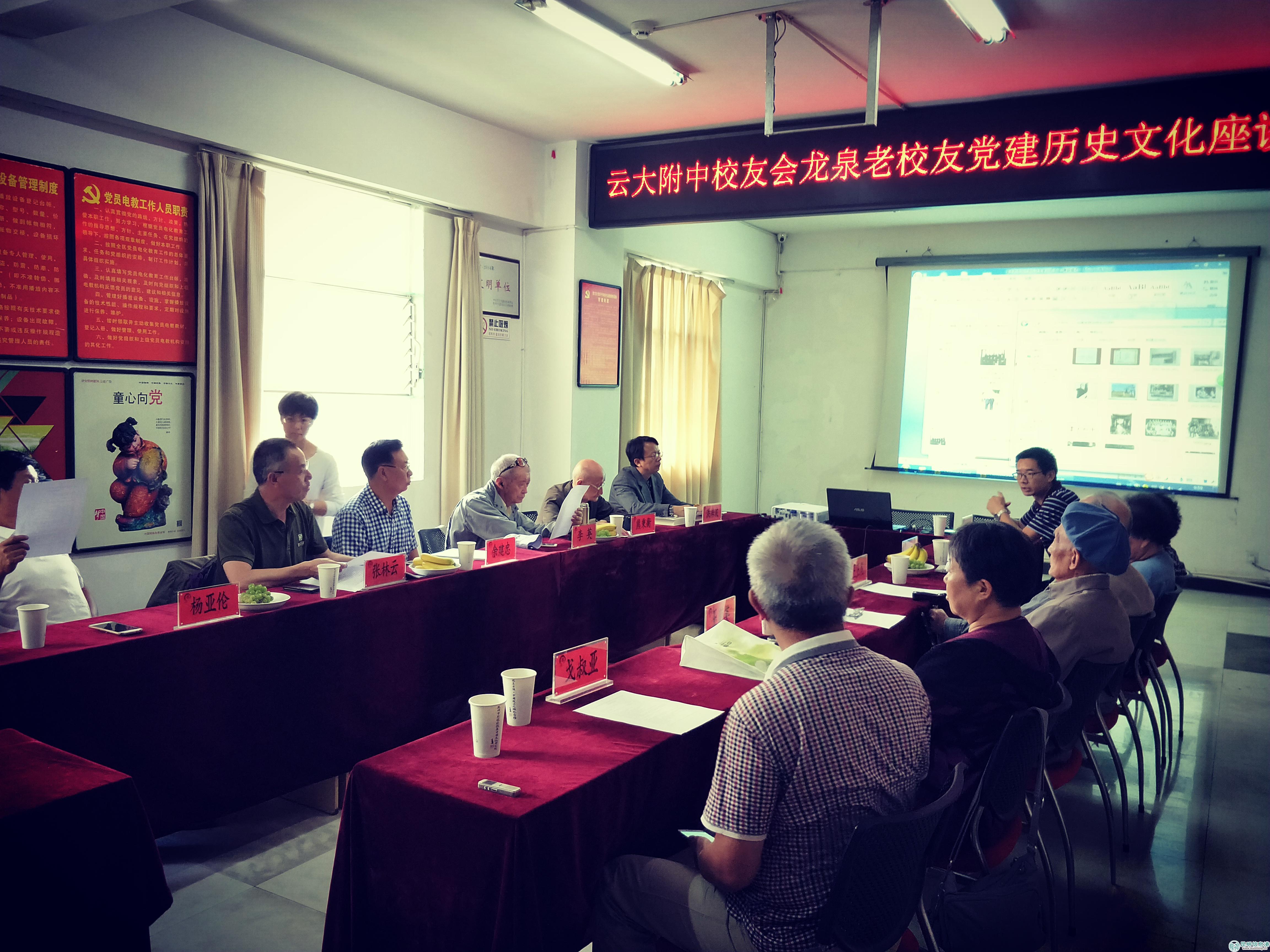 云大附中工会主席张林云介绍云大附中校友会情况及1942年至1948年云大附中在龙泉镇的办学历史和党建文化。云大附中龙泉老校友、老地下党员一一发言,介绍云大附中在龙泉镇的相关历史与中共地下党在龙泉地区的活动情况。龙泉古镇文化研究院洪海波、戈叔亚、杨亚伦发言。座谈会上播放云南附中在龙泉地区办学的相关文字和图片资料,大家热烈讨论,畅所欲言,共同回顾历史、展望未来。