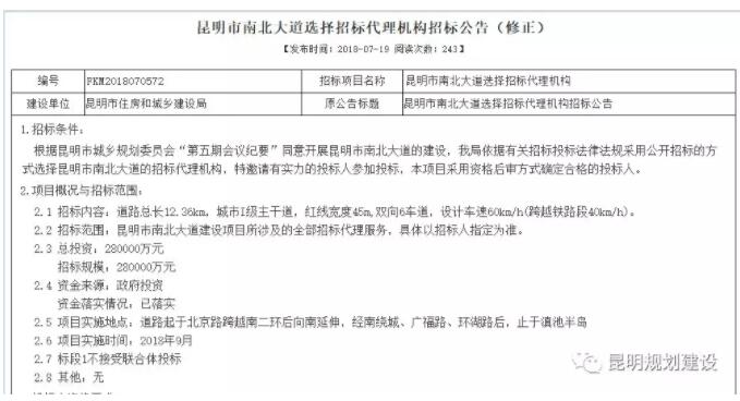 6686体育讯(昆明日报 记者吴劲松)7月19日,昆明市住房和城乡建设局发布《昆明市南北大道选择招标代理机构招标公告》。昆明将建设一条12.36公里双向6车道的城市I级主干道,从北京路直达滇池半岛,这意味着未来从北京路的最北端北部山水新城,可以直通滇池畔。这条大道也将成为真正的昆明“第一大道”。