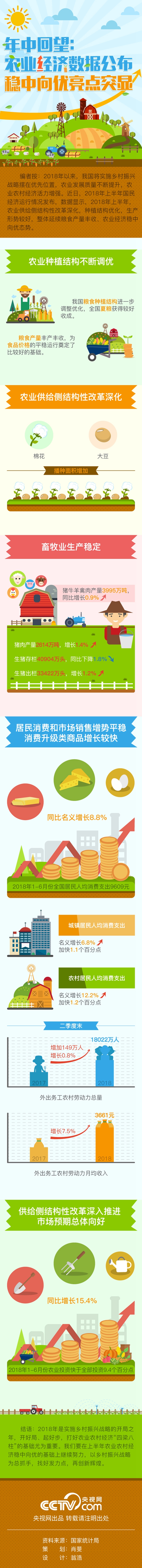 央视网消息:2018年以来,我国将实施乡村振兴战略摆在优先位置,农业发展质量不断提升,农业农村经济活力增强。近日,2018年上半年国民经济运行情况发布,数据显示,2018年上半年,农业供给侧结构性改革深化,种植结构优化,生产形势较好,整体延续粮食产量丰收、农业经济稳中向优态势。