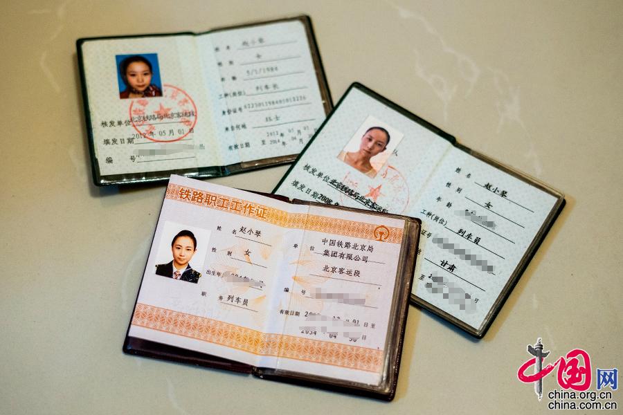 赵小琴留着自2003年到铁路工作以来各个时期的工作证。在铁路工作的十五年间,她先后经历过8种车型和十几条线路。小小的工作证见证了她从乘务员到列车长的成长,也见证了改革开放这些年中国铁路从速度150km/h到350km/h的飞奔。中国网 郑亮摄