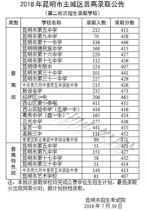 2018年昆明市普高第二批次录取分数线刚刚正式揭晓。