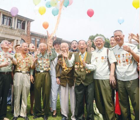 “八一”建军节即将来临之际,上海新四军 “沙家浜”部队历史研究会在上海佘山西郊庄园举行庆祝中国人民解放军建军91周年座谈会。现英雄“沙家浜连”代表赶到现场,与原沙家浜部队老战士喜相逢,抚今追昔思奋进。图为新老战士放飞气球共庆佳节。(傅国林摄影报道)