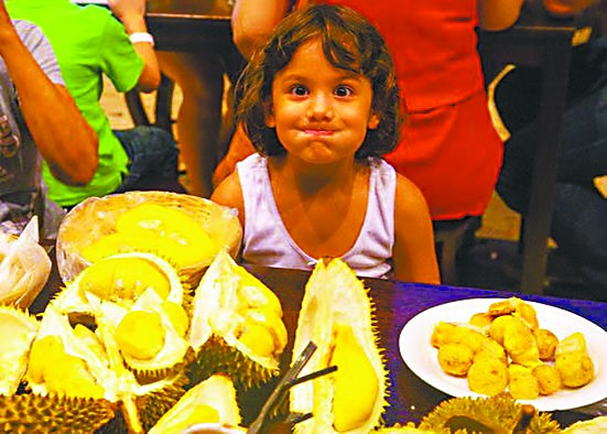 我可以一个人吃海南鸡饭,可以独自在美术馆里惊叹大师的创意,但绝对不能一个人吃榴莲。每逢榴莲季节,我家附近的水果摊摆出了榴莲阵,每次经过都会心动,但从不行动。短暂的榴莲季吃不了几次“邪恶”(糖分高,燥热)的果实,因此要珍惜每次吃榴莲的机会。榴莲要和好朋友一起吃,一起弄脏手,一起吃到口臭,才能吃出味道。现在看见有人在新加坡吃榴莲,带着吃小龙虾的透明手套,就知道他们都不是本地人。吃完榴莲新加坡人会在榴莲壳上放点盐水,喝下去,能解燥热。