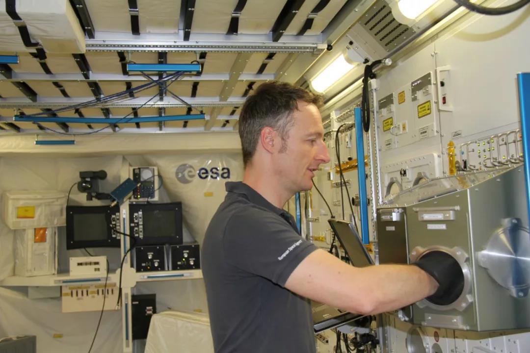 △马天在欧航局“哥伦布”实验舱模拟舱内展示实验操作。