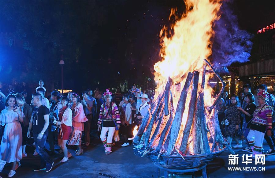 8月5日,在云南省楚雄彝族自治州彝人古镇,人们身着盛装,载歌载舞,欢庆彝族传统节日火把节。