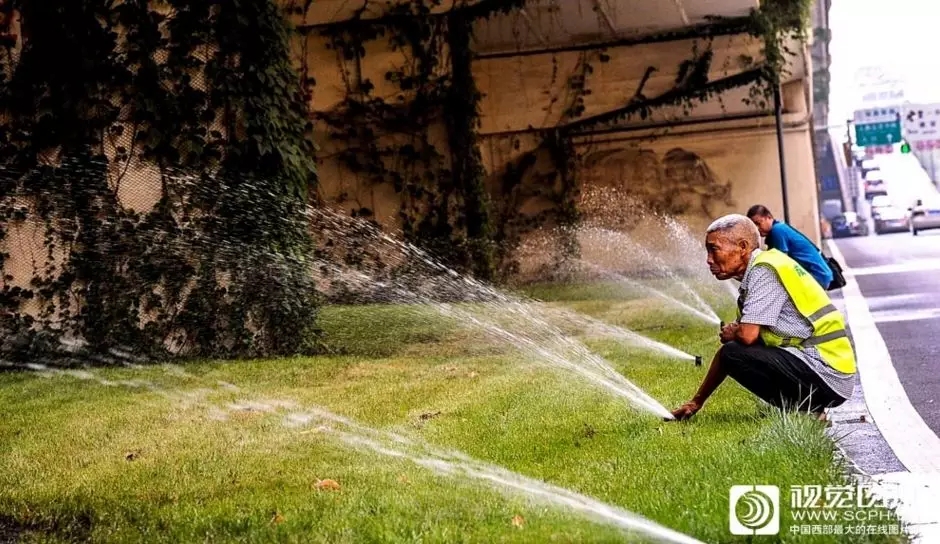 园林工人沿街为城市道路两旁的行道树木草坪送来甘泉。