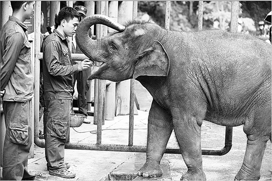 香蕉、胡萝卜、西瓜、菠萝……3岁的公象“小强”和他的伙伴们悠然地享用着饲养员“象爸”“象妈”精心准备的“自助餐”。