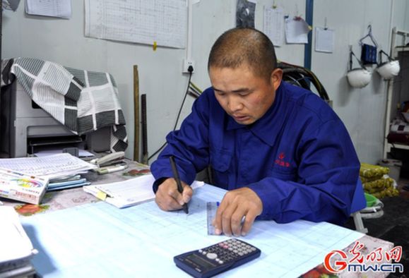龙勇军在工地宿舍里正在埋头工作。采访中,他告诉,自己那年准备去北京捐献时恰好临近年底,当时手头有各种各样的事,但最重要的是把工友们的工资及时结算完,让大家开开心心地回家过年。(李政葳/摄)