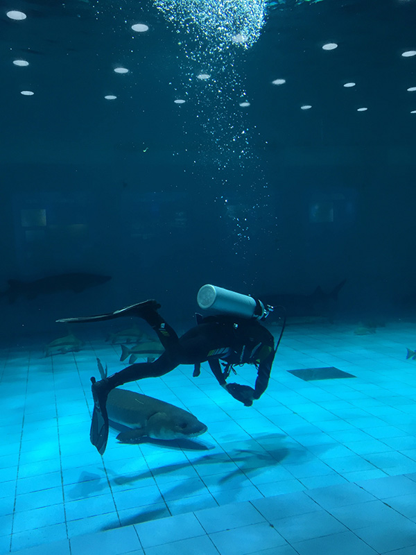 他在中华鲟的鱼池里放了一条俄罗斯鲟鱼,让人们更容易看清二者的区别。俄罗斯鲟鱼的吻部(嘴)较细长,甚至上翘。