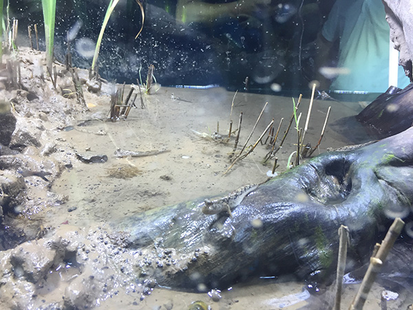 鱼缸大小的水族箱里分别“居住”着水草间游动的淡水鱼、趴在老树根和泥滩上的跳跳鱼、鳗鲡、海蟹等。它们看似与中华鲟无关,但鱼缸对应着长江口及附近的生态环境——河流汇入大海,淡水过渡到咸水,江水海水潮涨潮落等。它们跟中华鲟都曾生活在同一片水域里,命运“休戚与共”。