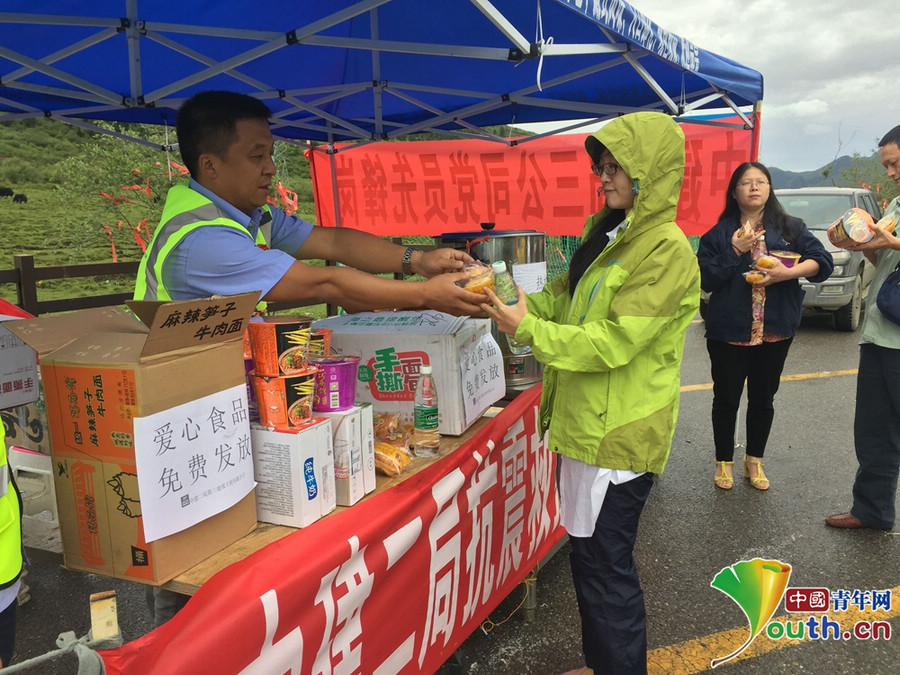 震后第二天,得知九寨沟还有大量游客没有转移,项目部3名党员立即奔赴九寨沟,在那里设立了“爱心服务站”,为受灾民众、武警,交警和游客,准备了足够数量的便携式氧气瓶、药品、食品、矿泉水等物资,还特意早早烧好开水,放在保温桶里。一天里,他们救助近200人次。