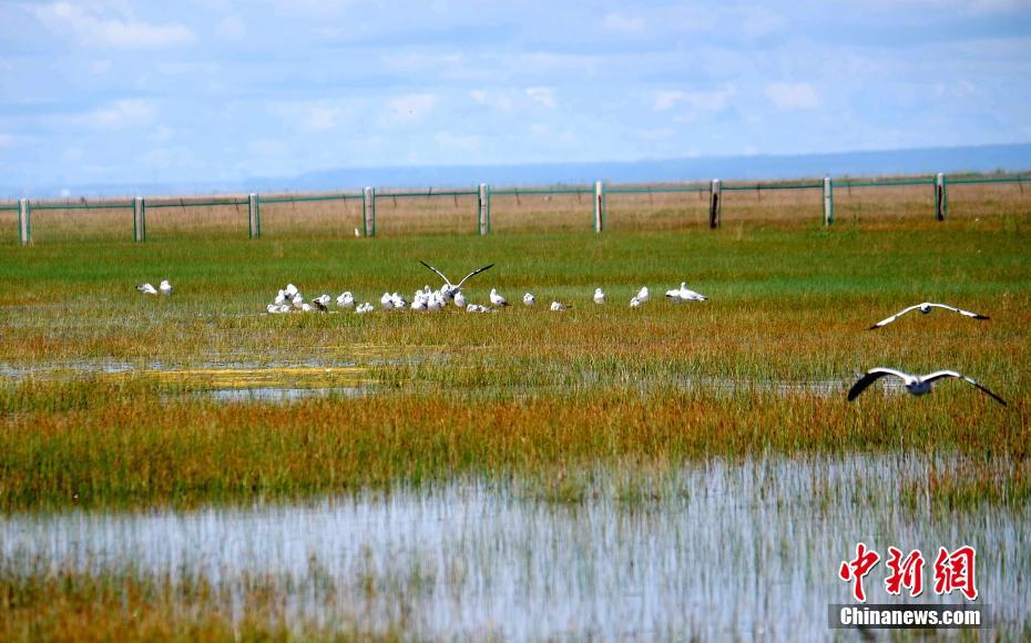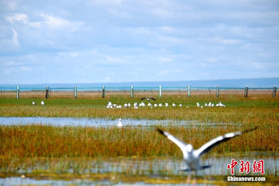 8月18日,青海湖北岸的海北藏族自治州刚察县仙女湾湿地,在此栖息的红嘴鸥。19日,记者从海北州委宣传部了解到,每年在青海湖迁徙停留的候鸟有92种、超过20万只,是中国境内候鸟繁殖数量最多、种群最为集中的繁殖地。中新社记者李隽摄