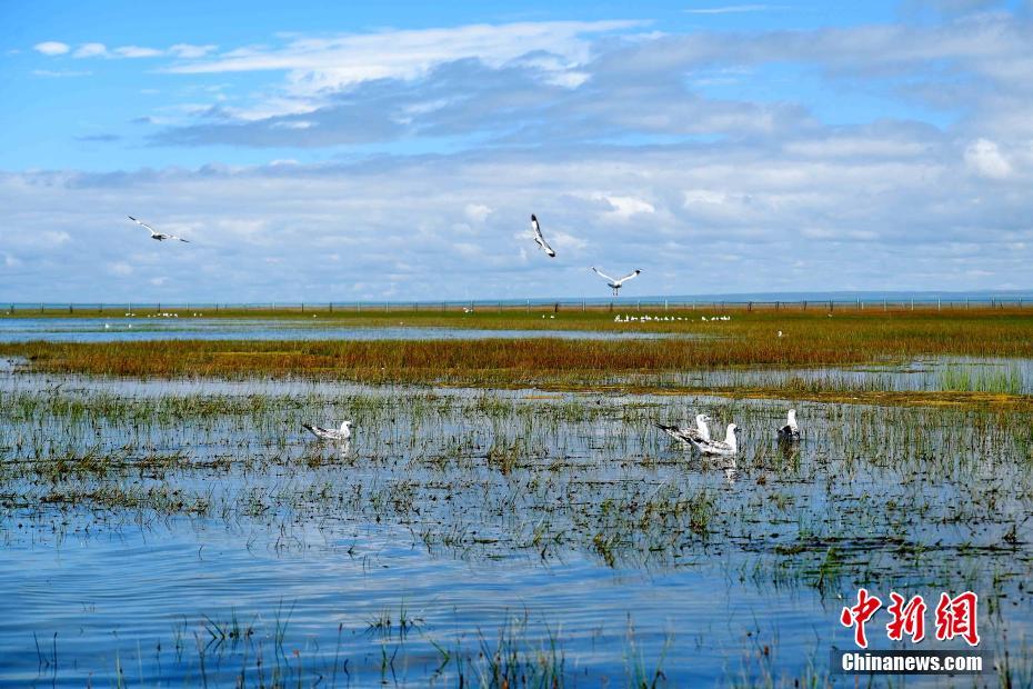 8月18日,青海湖北岸的海北藏族自治州刚察县仙女湾湿地,成群的红嘴鸥在湖面游弋。19日,记者从海北州委宣传部了解到,每年在青海湖迁徙停留的候鸟有92种、超过20万只,是中国境内候鸟繁殖数量最多、种群最为集中的繁殖地。中新社记者李隽摄