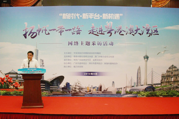 中央网信办网络新闻信息传播局负责人表示,广东作为中国古代海上丝绸之路的重要起点,在参与建设“21世纪海上丝绸之路”中拥有得天独厚的地缘和区位优势。建设粤港澳大湾区,是习近平总书记亲自谋划、亲自部署、亲自推动的国家战略,是新时代推动形成全面开放新格局的新举措,也是推动“一国两制”事业发展的新实践。希望网络媒体记者在采访中扎下身、沉下心,践行“走转改”精神,报道好粤港澳三地在新时代背景下,抓住“一带一路”倡议机遇,开创融合新格局,探索发展新路径,共同建设粤港澳大湾区的生动实践。