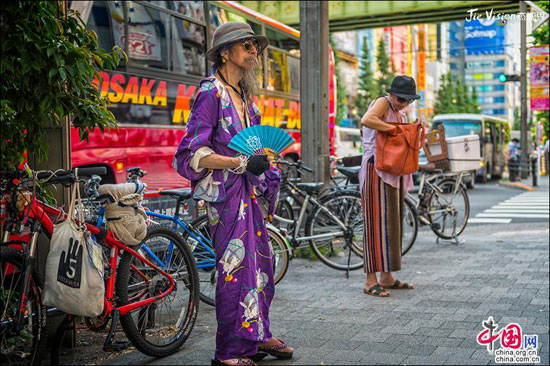 在秋叶原街头,你会看到穿着形形色色、奇装异服的人。刚刚下车我的目光就被一位身穿和服的日本老头所吸引。老头一缕长髯,手持折扇,脚踏木屐 ,从面相看极像七龙珠里面的龟仙人。 但是,他的形象你绝对不会和美联系起来。
