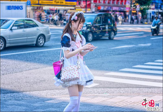在不远处有一位身穿女仆装的促销女孩,她向每一位过路的游客散发店铺促销广告。和那位“龟仙人”完全是一个天堂,一个地狱。