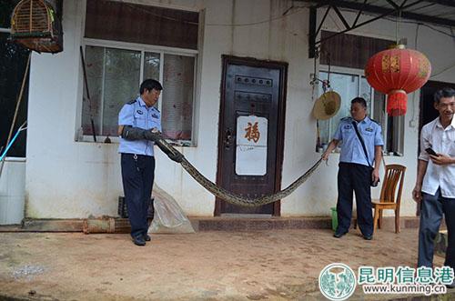 接警后,石屏县森林公安局迅速组织了富有捕蛇经验的民警赶往离县城80公里外的牛街镇尼腊村委会邑碑底村。在现场,民警发现蟒蛇体型硕大,长约3米、体重10公斤,考虑到安全因素,决定先将蟒蛇隔离观察,无碍后再进行处置。目前,蟒蛇经查鉴身体无伤害、具备野外生存能力,已被放生于无人林区,回归大自然。