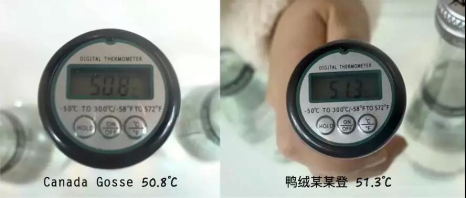 水温放进去时候的是 66.5℃,而一个小时之后,没有保温的热水瓶温度下降到 40.4℃,加拿大鹅下降到50.8℃,而波司登居然高达51.3℃。