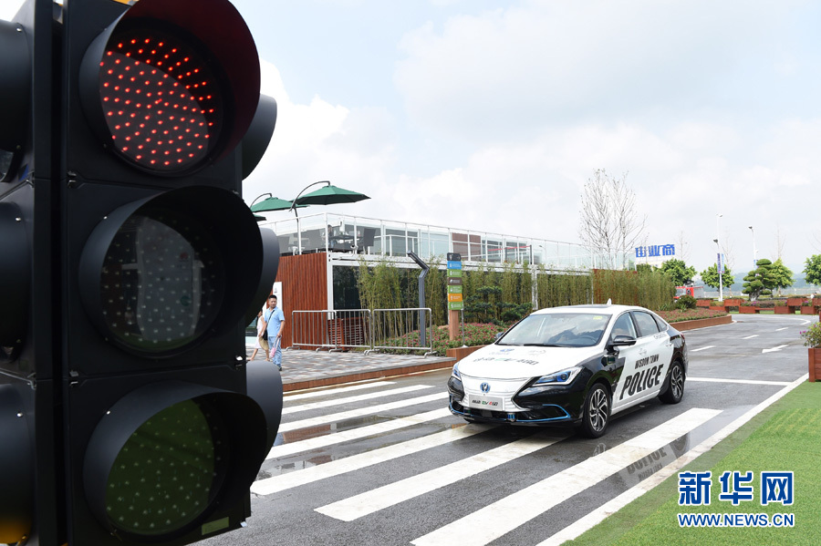 智慧小镇中一辆自动驾驶的车辆在辨识红绿灯后通过。新华社记者唐奕摄