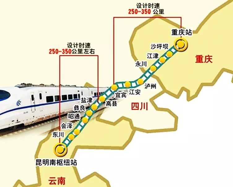 线路全长约718公里,设计时速为350公里,投资1170亿元。按照时速和路程来算,从昆明到重庆大约只需2小时左右。
