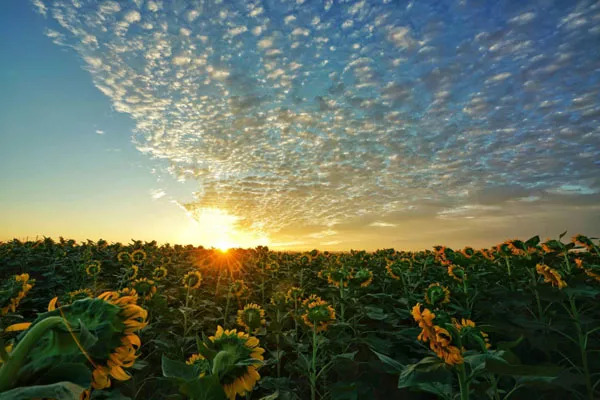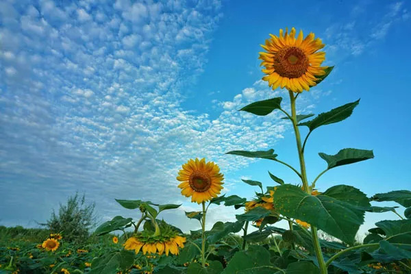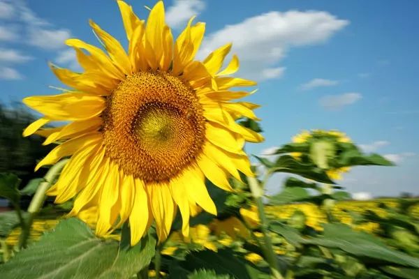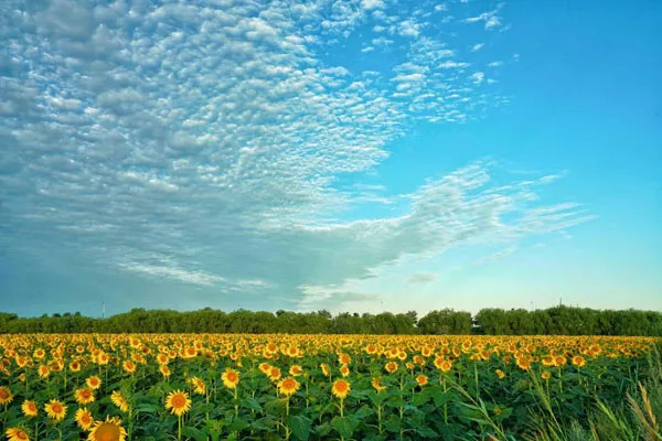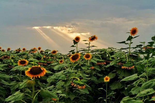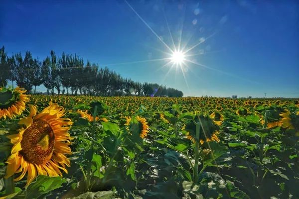 “万亩葵园的景色与其用美丽来形容,不如用壮观更为贴切。花开之时,齐刷刷地向着太阳,缓缓转动着金灿灿的花盘,不仅壮观,更是展现了向日葵的坚定、忠诚、自信、昂扬的宝贵品质。”