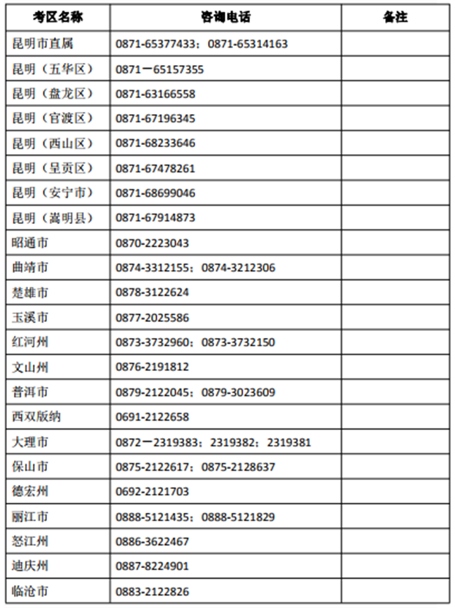 云南省2018年中小学教师资格考试(笔试)各考区咨询电话