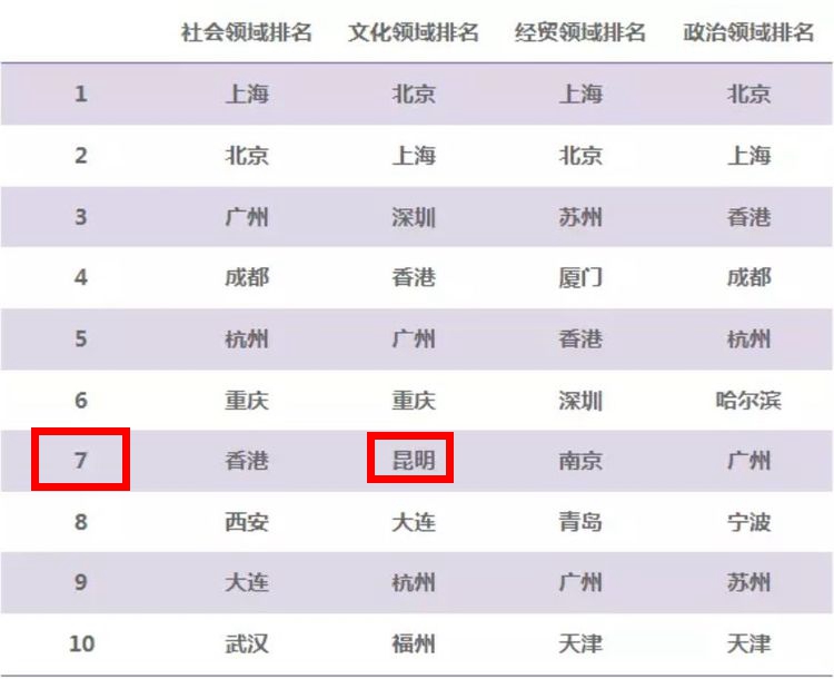 二级指数排名, 文化领域单项排名昆明列第7位。