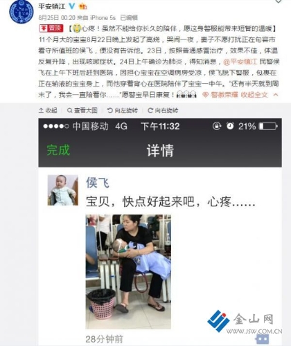 24日上午,妻子和其母亲带着孩子前往医院检查,被确诊为肺炎,需要输液治疗,妻子这才给丈夫打电话,告诉其孩子的病情,侯飞下班时才得知,他心急如焚,来不及换下警服就急忙赶往医院。