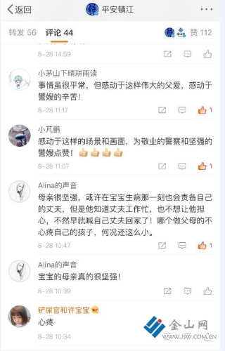记者浏览微博发现,这张照片感动了众多网友,有的为侯飞深沉的父爱而感动,有的为侯飞的敬业精神而感动,有的向辛苦的警嫂杨燕表达敬意。