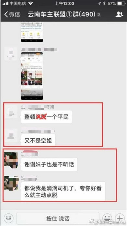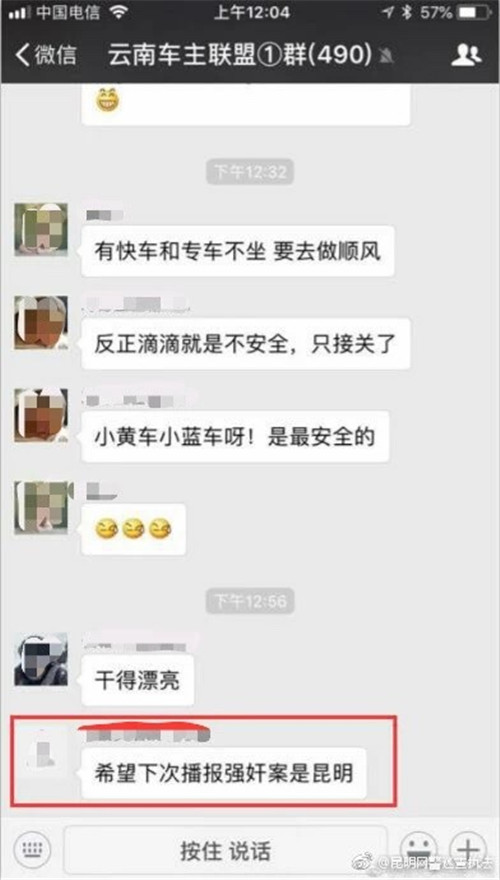6686体育讯 记者合宇聪 记者从昆明市公安局获悉,8月27日,昆明网警巡查发现有4名网民在近500人的“云南车主联盟①群”微信群内,就浙江温州女孩乘坐滴滴顺风车遇害案件发表侮辱性言论,内容低俗、不堪入目,引起广大网民的强烈愤慨,造成不良社会影响,公安机关发现线索后立即开展调查工作。