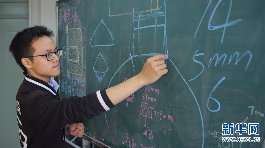 实训室里,一名学生在黑板上标注和计算首饰的尺寸。(新华网 周亚平/摄 念新洪、杨沛林/文)