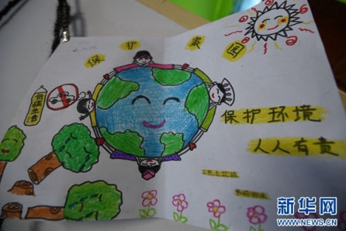 学生们创作的关于环保的海报。新华网 潘彬彬摄